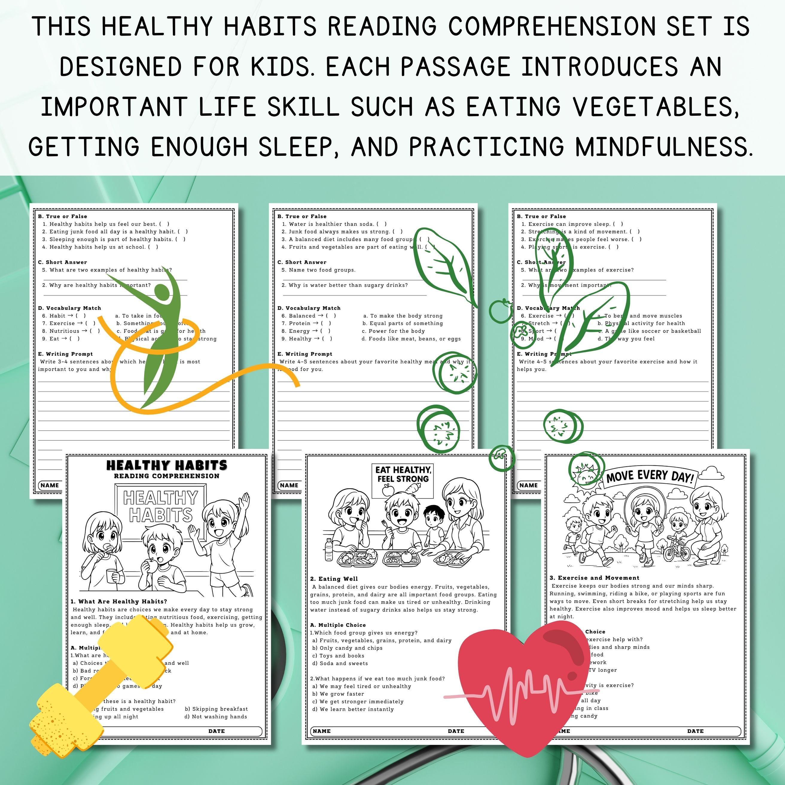 This 10-page Healthy Habits Reading Comprehension set is designed for Grades 3–6. Each passage introduces an important life skill such as eating vegetables, getting enough sleep, staying active, washing hands, and practicing mindfulness. Students will answer comprehension questions, learn new vocabulary, and complete writing prompts that encourage reflection on daily routines. Perfect for SEL lessons, literacy centers, or health education.