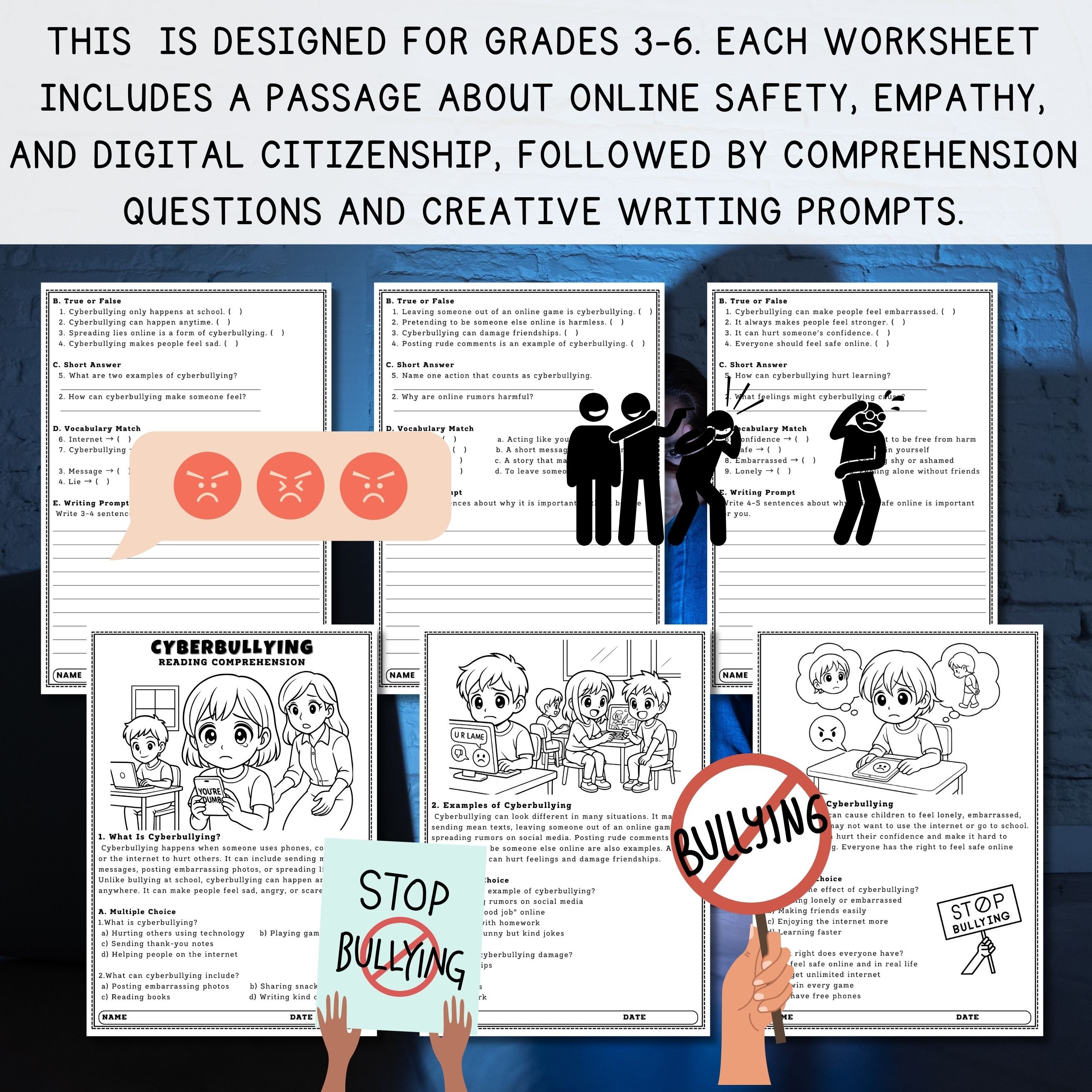 This 10-page SEL and Life Skills Pack is designed for Grades 3–6. Each worksheet includes a passage about online safety, empathy, and digital citizenship, followed by comprehension questions and creative writing prompts. Students will learn how to recognize, prevent, and respond to cyberbullying.